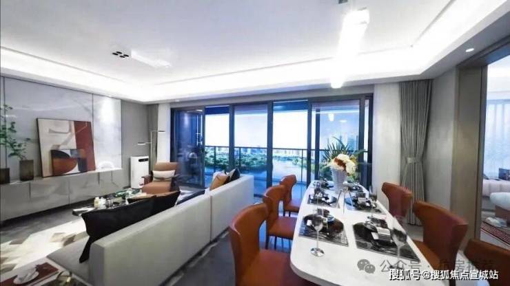 建面约139方户型最大的亮点还是南向餐客连厅,开间约6.9米,超大开间满足了采光通风,也使得视野最大化。无论是世界杯看球,还是过年聚会,这样的空间尺度都十分震撼。