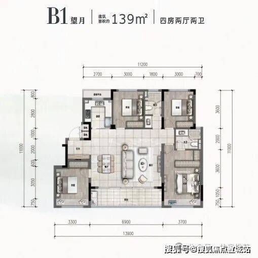 【B1望月户型】139m,4室2厅2卫,南、北朝向,户型价格【375/套】