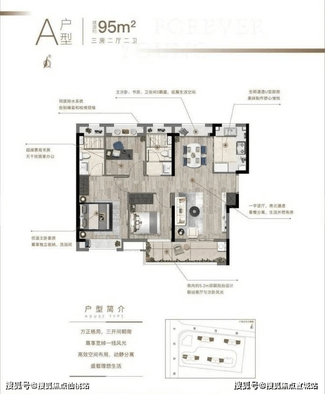 约95㎡3房2厅2卫户型,以边套为主,有非常好的采光和通透性。