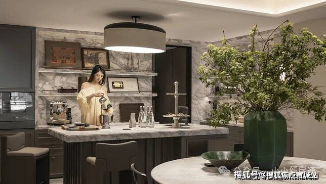餐厅空间按照私宴标准打造,1.1*2.3米的超大岛台兼具颜值及功能。