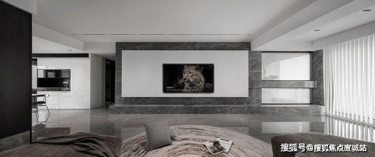 灰白色的整体调性,营造出安静惬意的居家感受。客厅采用爱马仕灰大理石,细腻的石材纹理质感,层层递进,开启视觉延展。