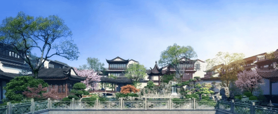 苏式园林风格,白墙黛瓦 + 庭院围合设计,复刻江南人居意境