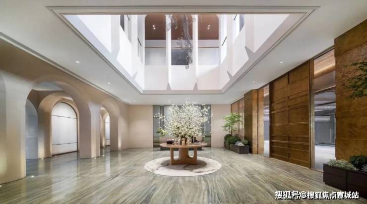 项目 东方殿堂级别 的公区设计,社区大堂中庭超7米挑空打通双层视野,12座拱形廊柱阵列环抱艺术装置,构成一座雅奢美学殿堂。