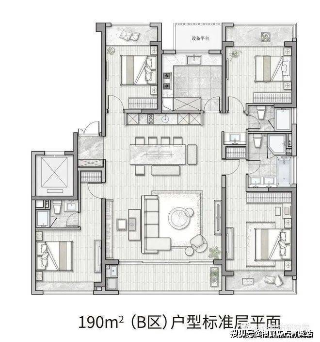 190㎡户型是经典的奢阔大平层规制,采用了经典的四叶草格局,中西双厨、南向双套房设计,高功能空间,充分满足互不打扰的精致生活;约6.45米大面宽客厅连接观景阳台,厨房、餐厅、客厅和阳台组成超大中心互动区,尽显尊贵,给生活更多的可能。