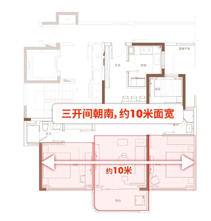 三开间朝南,南向面宽达约10米,阳光充足;餐客厅与阳台形成流畅动线,社交空间舒适开阔;弧形阳台放大景观视野;主卧预留独立衣柜空间,卫生间罕见南向采光,舒适度拉满。