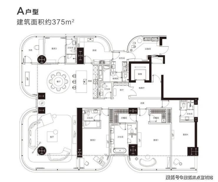 375㎡高定大平层:6房6卫,得房率93%,层高3.8米,南向面宽24米