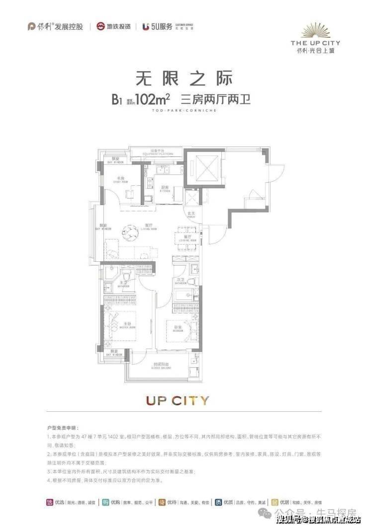 建面约102㎡三房双南卧+大阳台,空间利用极致,主卧套房带独卫,南北动静分区,直接把市场同级别产品拉开一档。