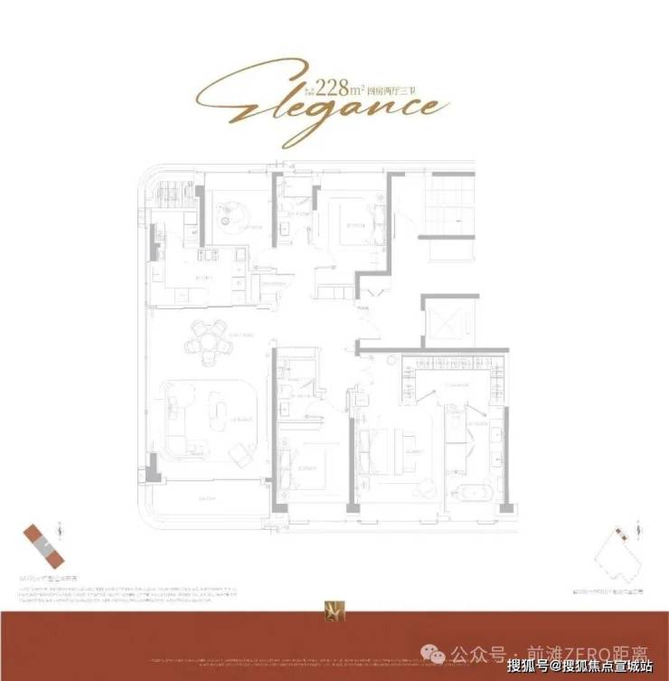 主力户型约228㎡4房两厅三卫,面宽达5.6米,配备270°环幕落地窗,客餐厅一体空间约53㎡,主卧套房面积约50㎡(含10㎡衣帽间与15㎡卫浴),完全满足高净值家庭“大空间、强功能”的居住需求。