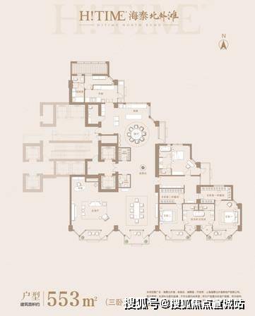 553㎡户型:奢阔 4 室格局, 60 米极致面宽, 14 个独立阳台,户户朝南,全明通透,客厅挑高设计,空间开阔大气,可满足家族团聚、圈层社交的多元需求,主卧套房面积超 80㎡,配备独立书房、卫浴、衣帽间、观景露台,私享极致尊崇。