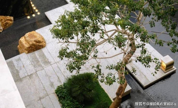 下沉庭院采用大面积静水面结合造型树的方式打造,同时局部设置叠级分台的方式增加空间的层次。