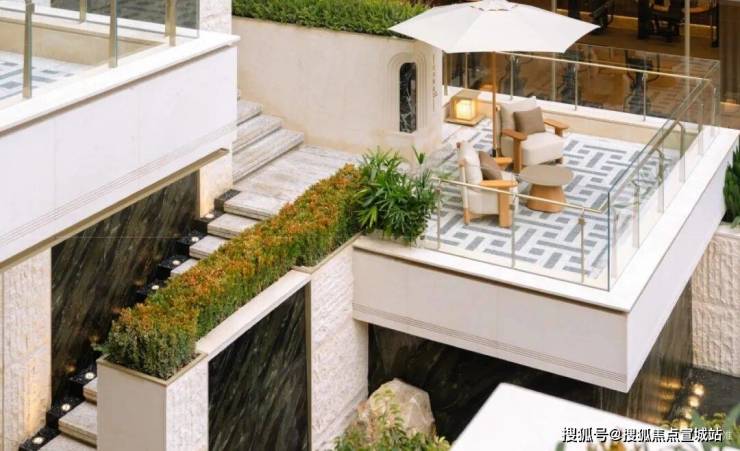 下沉式庭的四周设置有不同高差的瀑布以及高低不一的观景平台,使整个庭院的景观更加立体丰富,同时也创造出不同视角的观景视角。