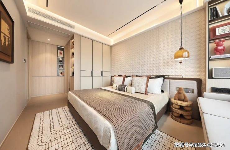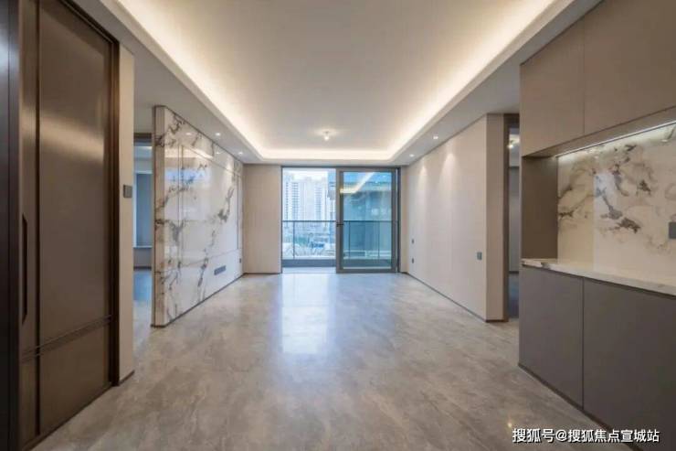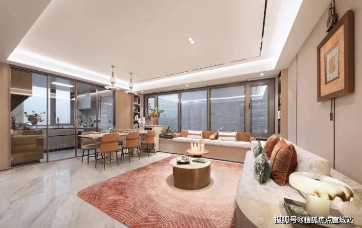 归家动线以环绕下沉式庭院布置。漫步在连廊之上,以水为引再铺陈精选的绿植,随手一拍,松弛气场油然而生。