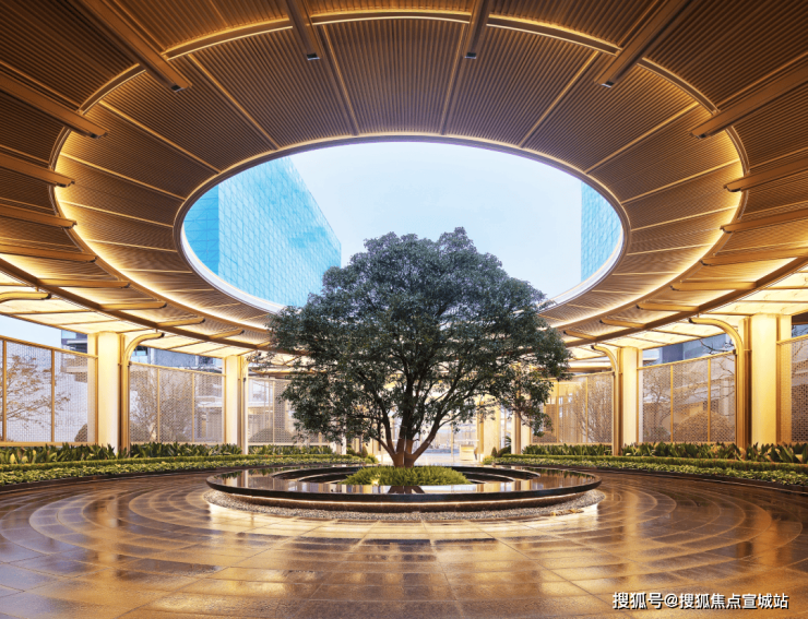 进入大门之后的庭院,用11根约5.3米高的弧形柱子,环绕拉升起了一个巨大的藻井空间,吊顶大手笔用了透光云石,柱顶嵌入了奢石;正中央更是种下了一株百年古桂树,冠幅有约7.6米,树高有约7米,一眼望去仿佛撑满了整片藻井天幕。