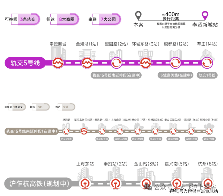 交通方面:项目多轨交环绕,5号线、15号线南延伸段(在建中)、市域嘉闵线南延伸段(规划中)、沪乍杭高铁(规划中)及南枫线(在建中)