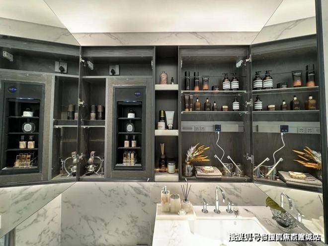 双卫配置,其中一个做了干湿分离,科勒台盆+双智能马桶,除雾镜柜均内置了牙刷消毒器、预留吹风机插座。主卫镜柜还有美妆冰箱,收纳空间相当充足。
