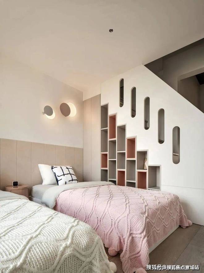 起居室与儿童床通过楼梯自然过渡,楼梯下方的三角空间被充分利用,成为一个充满童趣的角落,用于收纳玩具和童话书。
