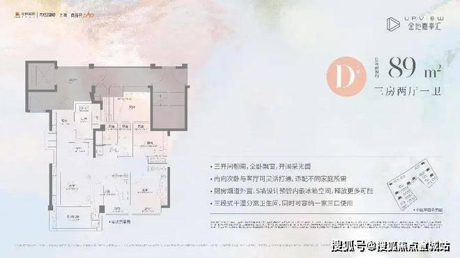 建面约89㎡三房两厅一卫(D户型),不仅功能完备,而且很好地把控了总价,约350万起即可上车高配品质三房,堪比市场上110平左右的空间感!