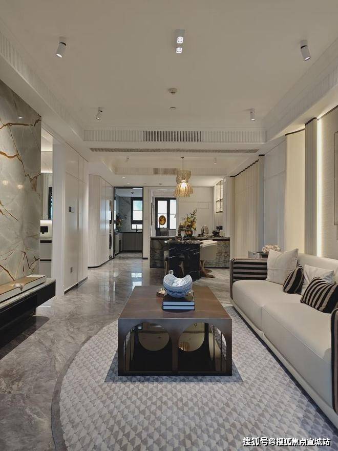 背景墙比别人更多一点.天然石材的电视背景墙,高级大气;编织皮革的客厅背景墙,充满质感;过度用的是白色木饰纹的背景墙,简约耐看;餐厅处又是白色皮革背景墙,大方优雅.整个空间过渡自然,增加了层次感和高级感.