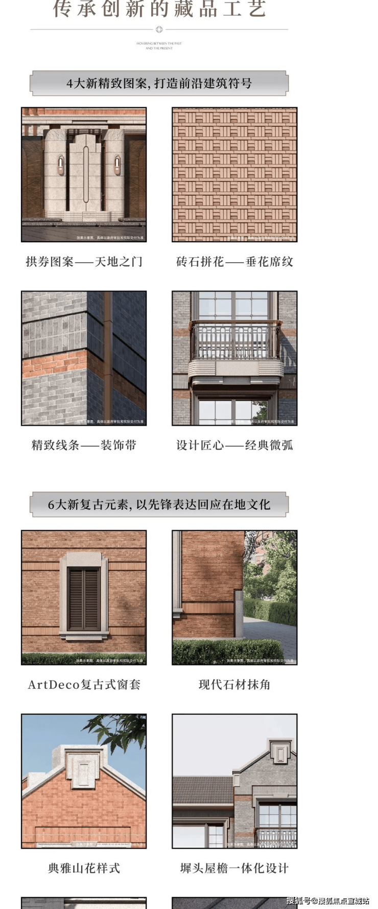 ②新复古元素深入看细节,你会发现项目高颜值的6大新复古元素.包括Artdeco复古式窗套、现代石材抹角、典雅山花样式、墀头屋檐一体化设计、经典仿木百叶、石库门专属地砖符号等,用先锋表达回应在地文化.