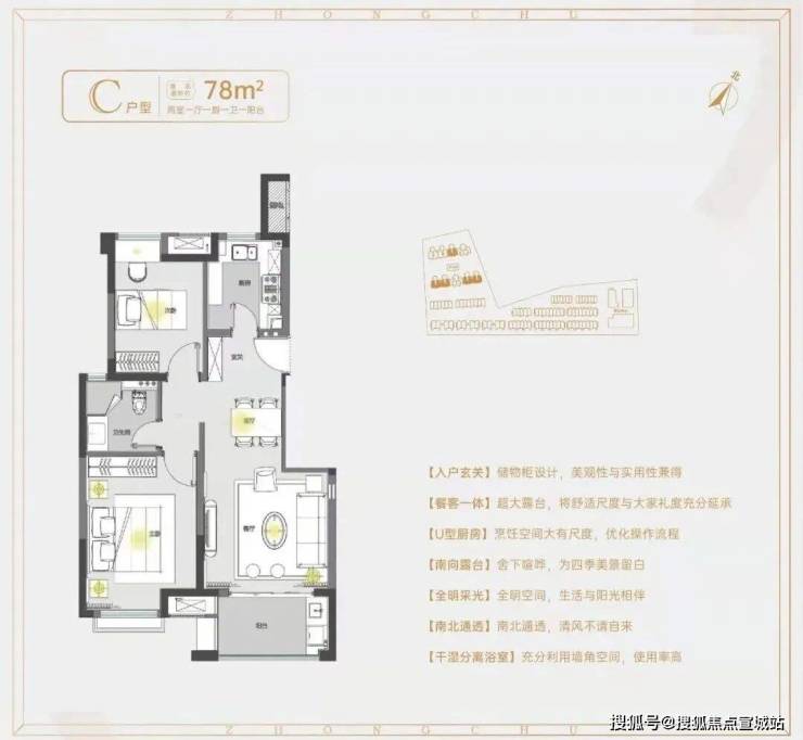 建面约78㎡2房1卫户型,做到了双开间朝南+南北通透+卧室带飘窗+动静分离,功能区划分、动线都非常清晰。