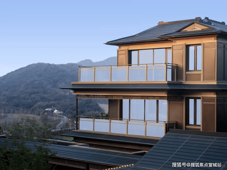 建筑立面:古今交融的诗意表达:外立面以香槟金铝板为基调,搭配蓝眼睛石材与玻璃幕墙,融合传统歇山重檐、纳福悬鱼等元素,既保留宋式建筑的对称美学,又赋予现代建筑的轻盈通透。合院组团采用三面庭院设计,L型景观面与环绕式檐廊,将超山梅影、丁山湖光引入每一扇窗景!