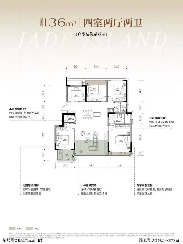 客厅约47方,接近市面上190方才有的户型尺度。