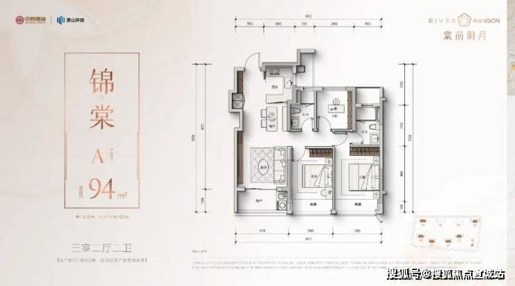 - 94㎡三房:三开间朝南,南向面宽近10米,1.5米进深阳台,独创“S墙”嵌入双开门冰箱。