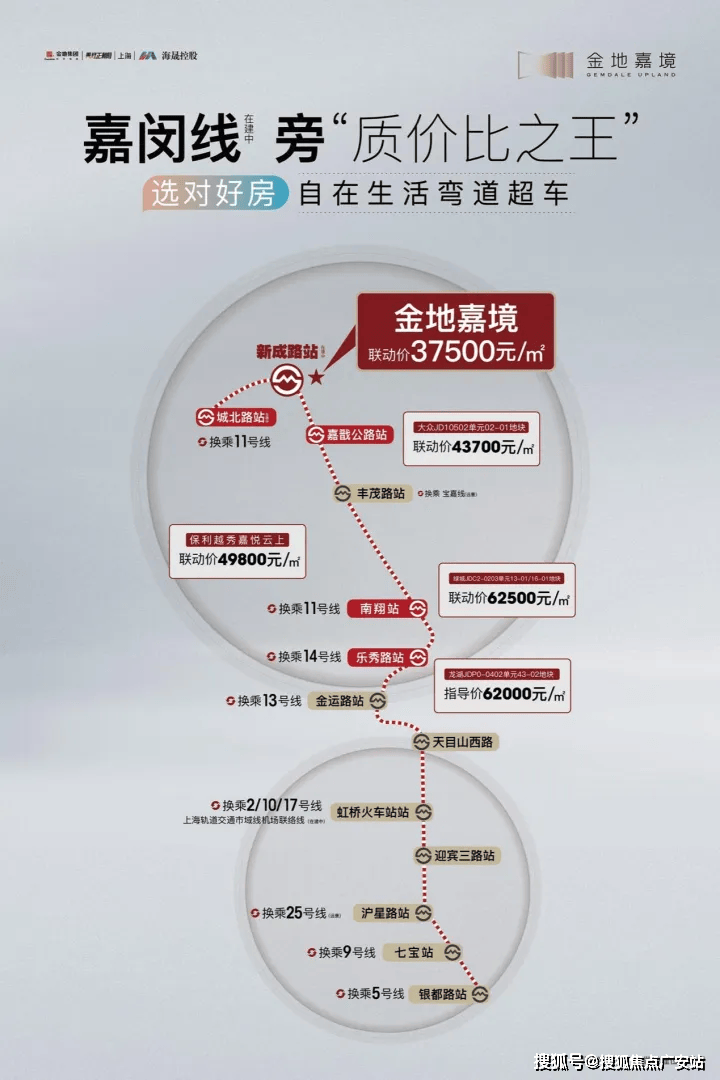 首先,在地铁方面。金地嘉境距离嘉闵线新城路站(在建中)直线距离约1.2km,乘坐地铁3站到南翔,7站到虹桥,无缝接轨大虹桥商务区。嘉闵线作为连通嘉定与闵行的大动脉,串联3个副中心、4个地区中心以及3个历史古镇。可轻松换乘11号线等十余条轨交,可在短时间内便捷通达徐家汇、真如等市区繁华商圈。