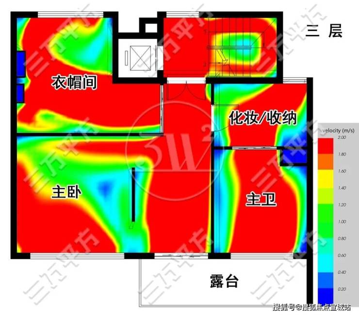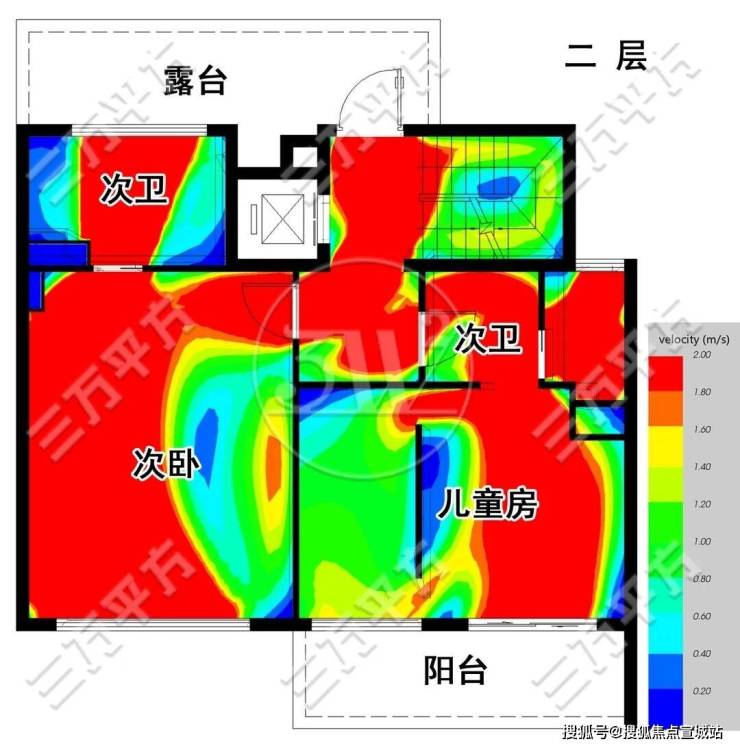 如下图,图上模拟计算的是在春夏季西南风环境下,户内的通风情况。颜色代表风速,红色最优,蓝色基本静止。可以看到,所有房间都拥有最好的通风条件。