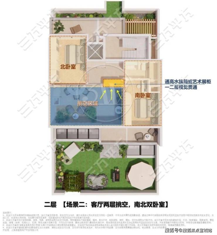 【场景二:客厅两层挑空,南北双卧室】适配精英社交场景的二层空间布局方案