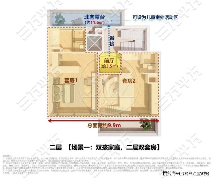 针对多代同堂、多孩家庭的居住需求,天誉原墅二层依托约 9.9 米南向三开间,规划双套房设计,从容满足双孩成长生活。约3.5㎡前厅衔接约11.6㎡北露台,可拓展为儿童室外游乐区。