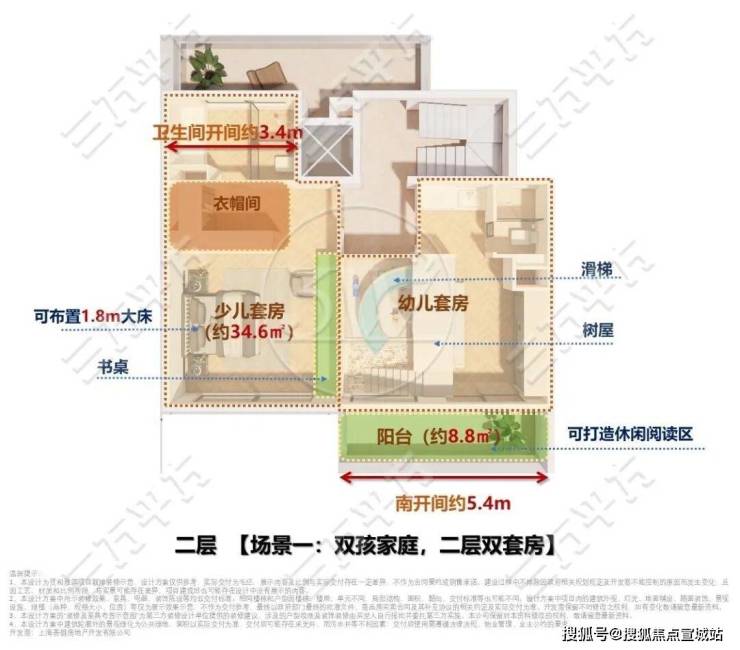 东侧约5.4米面宽空间,可规划幼儿卧室与童趣活动室,搭配树屋、滑梯等设计,联动南侧约8.8㎡阳台打造休闲阅读区,赋予孩子自由灵动的成长天地。