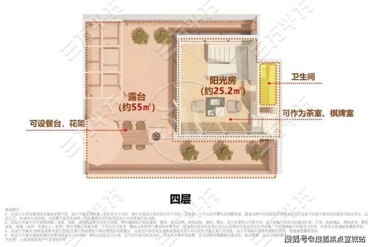 相较于市面上坡屋顶阁楼利用率低的痛点,天誉原墅的平屋顶设计自由度更高。可打造约25.2㎡的阳光房,配置卫生间,作为棋牌室、茶室使用。约55㎡露台,可设置餐台、花架等,延展出生活的更多可能。