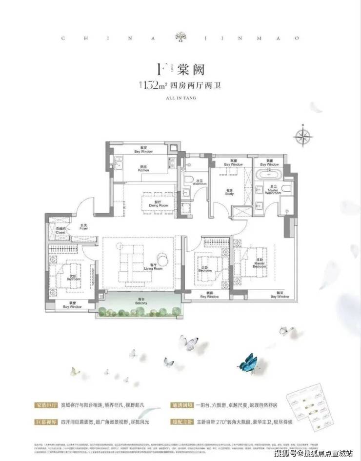 建面约117㎡3房2厅2卫,做到了3+1开间朝南+5个飘窗+主卧套房设计+270°转角飘窗,所有的尺度都有进一步提升。