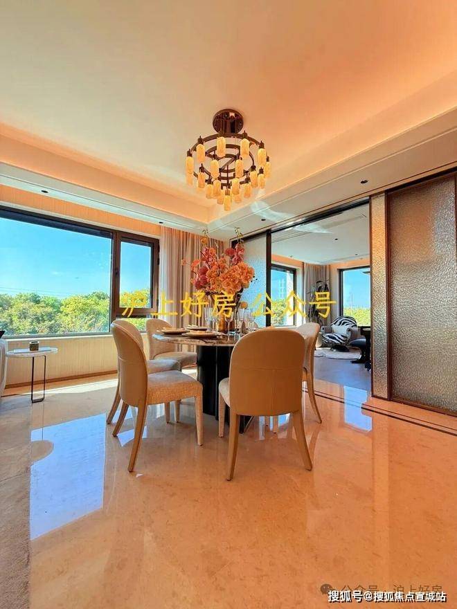 客餐尺度达约7.5米面宽,270°极致环幕窗景,实现了三面采光,无论在客厅、餐厅还是书房,葱郁园景皆如流动画卷,成为空间的主角。