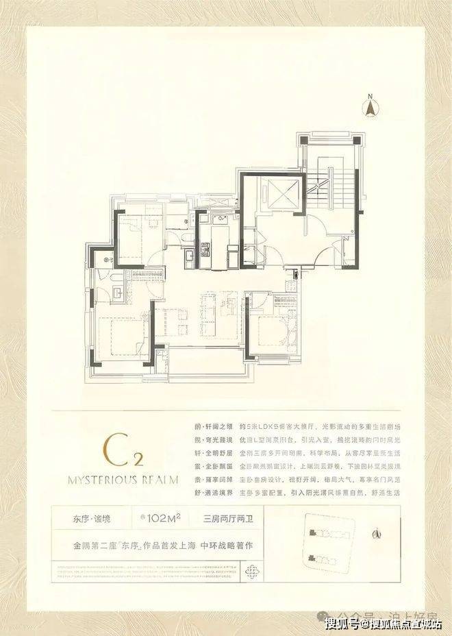 约102㎡的全明户型,三房两厅两卫格局,设计同样巧妙。