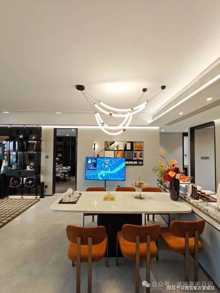 项目设计师的理念是“真正的奢华是自由”。超大的方厅,面积近50㎡,面宽约5.4米。这里可以轻松实现电器柜、岛台、长桌、沙发、钢琴等丰富的生活场景。