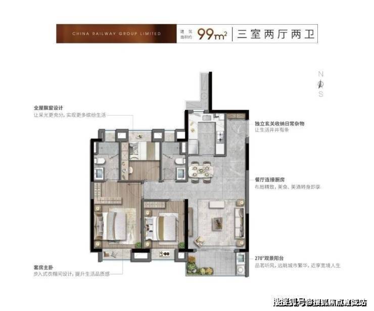 中铁诺德璟宸售楼处电话:400-8618-004又如项目爆款99m²洋房户型,仅11F高度进一步拉低公摊,通过腰部入户,打造北卧无连廊设计的飞机户型,以此划界约38m²客厅、餐厅、厨房、阳台一体的开阔空间,不仅南北通透引清风穿堂入户,亦无过道空间浪费,为家人休闲互动留白更多尺度。