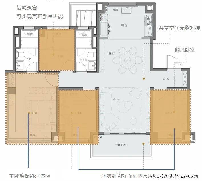 整个户型外延一圈被飘窗和阳台包裹起来。