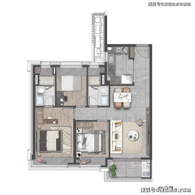 此户型贴合现代家庭的生活需求,无论是三口之家还是三代同堂,都能保证每个人拥有独立的空间。