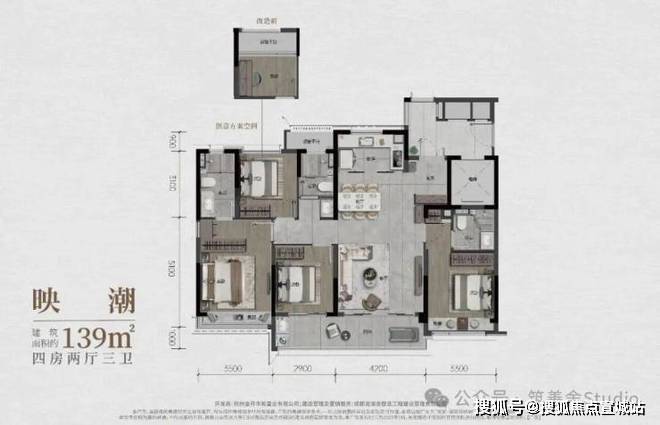 139㎡的四房三卫户型,南向13.9米超宽面宽,四开间朝南,客厅宽达4.2米。更令人惊喜的是,它拥有3个卫生间和双套房设计,并配有阳光入户花园和双重玄关。