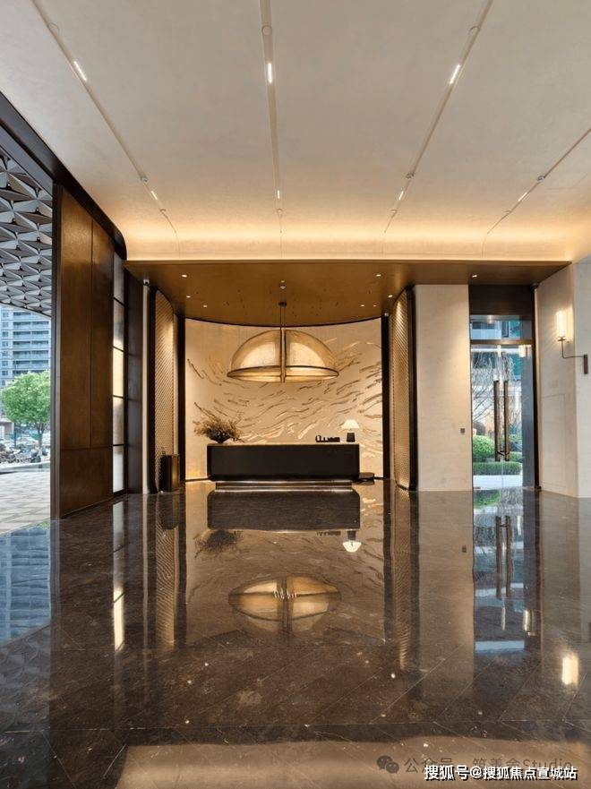 外立面采用窄边框设计,呈现全面屏效果,以极细银白色、深灰色铝线条勾勒出艺术画框的精致轮廓。每一层更以香槟金铝板线条打造独特小画框,镶嵌大面积晶钻玻璃,尽显超级平面美学。