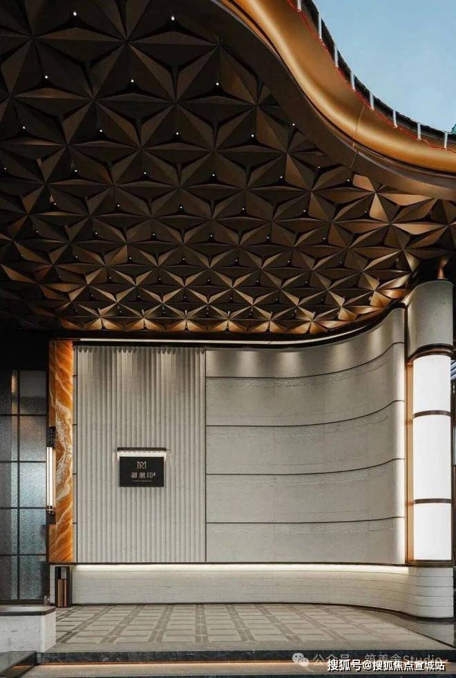 御潮印的门头是板块内最大的,宽达60米,高约6.8米,很大气的。价值百万的迎客松,搭配3.4米高的云石灯,铺陈进口孔雀玉、贝金米黄等奢石,与奥映鸣翠同款石材相得益彰。香槟色龙鳞铝板吊顶,千片龙鳞精密排布,更显恢宏气度。