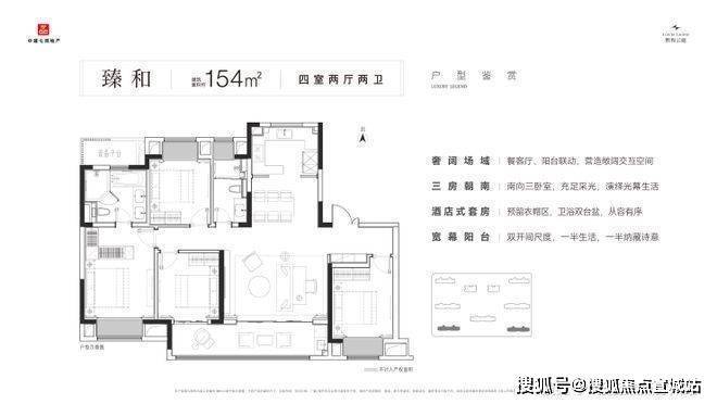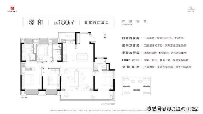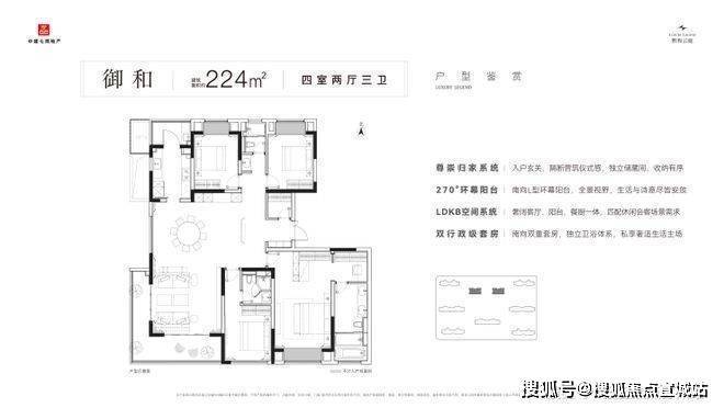 户型亮点:围合式布局,LDKB 一体化设计,部分户型带双主卧套房、全景落地窗与五重飘窗;179㎡、224㎡户型注重私密性与尺度感,适配高端改善。