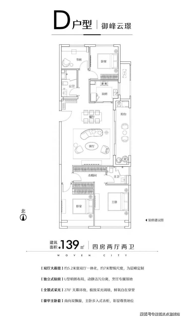 以建筑面积约139㎡为例:“四叶草”设计,让四个卧室格局独立,每位家庭成员都可以享受到无比舒适的起居尺度和私密生活;客餐厅一体化设计,集合了欢聚时光与亲密关系,营造出开放的互动场景;与宽厅自由接洽的跑道式阳台,更打破了空间界限,迎纳风景与阳光入室.