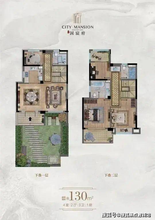 叠加别墅:中叠建面约 67 平(两房两厅一卫);上叠建面约 89 平(两房两厅两卫)、113 平(三房两厅两卫);下叠建面约 130 平(四房两厅三卫)。