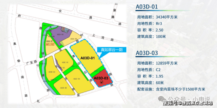 A03D-01地块:出让土地面积34340平方米,土地用途为普通商品房,规划容积率2.5,计容建筑面积85850平方米。