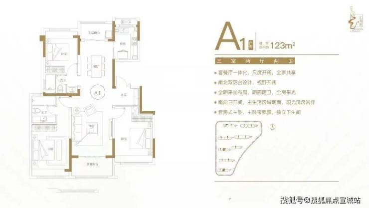 建面约123㎡三室两厅两卫户型特点:客餐厅一体化,尺度开阔,全家共享;南北双阳台设计,视野开阔;全明采光布局,明厨明卫,全房采光;南向三开间,主生活区域朝南,阳光清风常伴;套房式主卧,主卧带飘窗,独立卫生间。