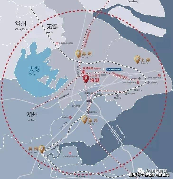 苏州南站(汾湖站)位于长三角一体化先启区——汾湖,沪苏湖铁路、通苏嘉甬城际高铁于此呈“十字”交汇,其中沪苏湖铁路由上海虹桥枢纽引出,途经上海松江、苏州吴江,至浙江湖州站,通车后将实现由汾湖8分钟到松江,20分钟到达上海虹桥枢纽,将汾湖与上海更紧密的联系在一起。