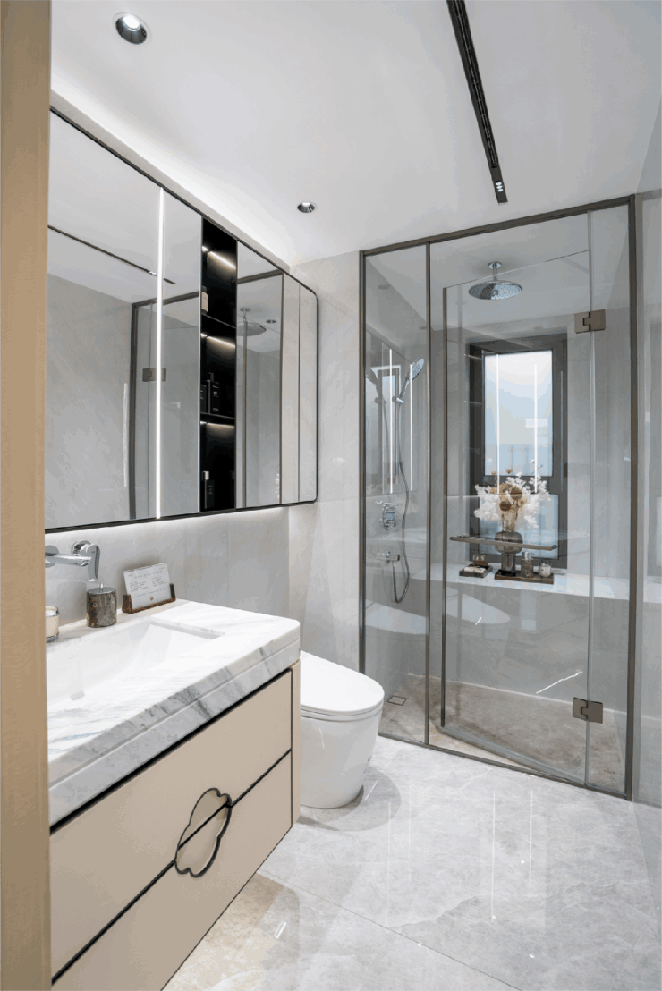 卫浴同样是高端配置,主卫与次卫均采用 唯宝品牌座便器,其中主卫更是唯宝智能一体座便器;淋浴龙头、台盆龙头等五金件则选用 高仪品牌。